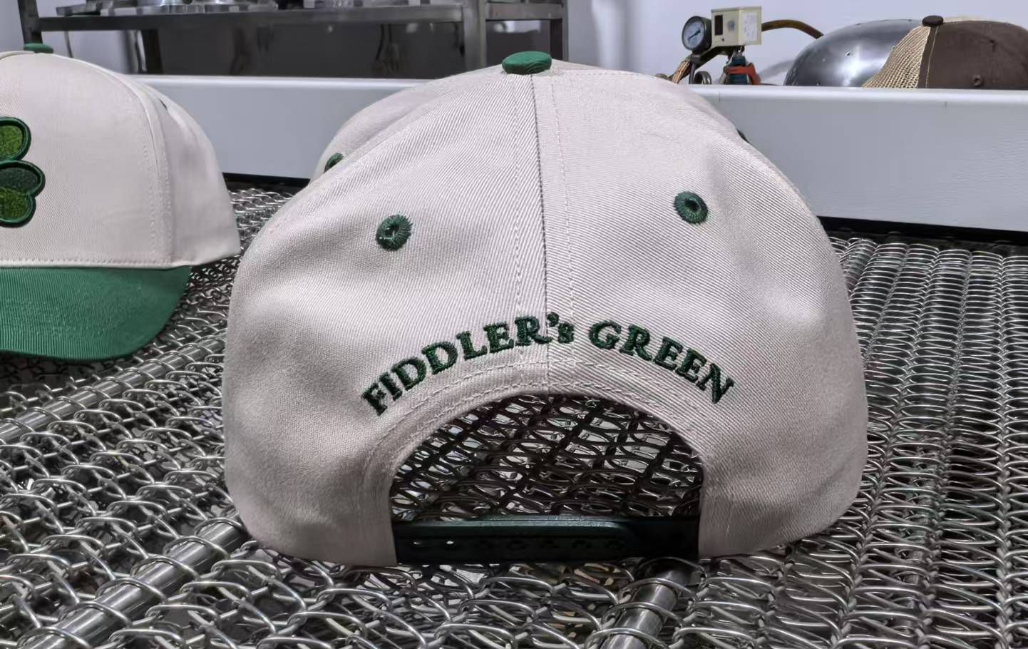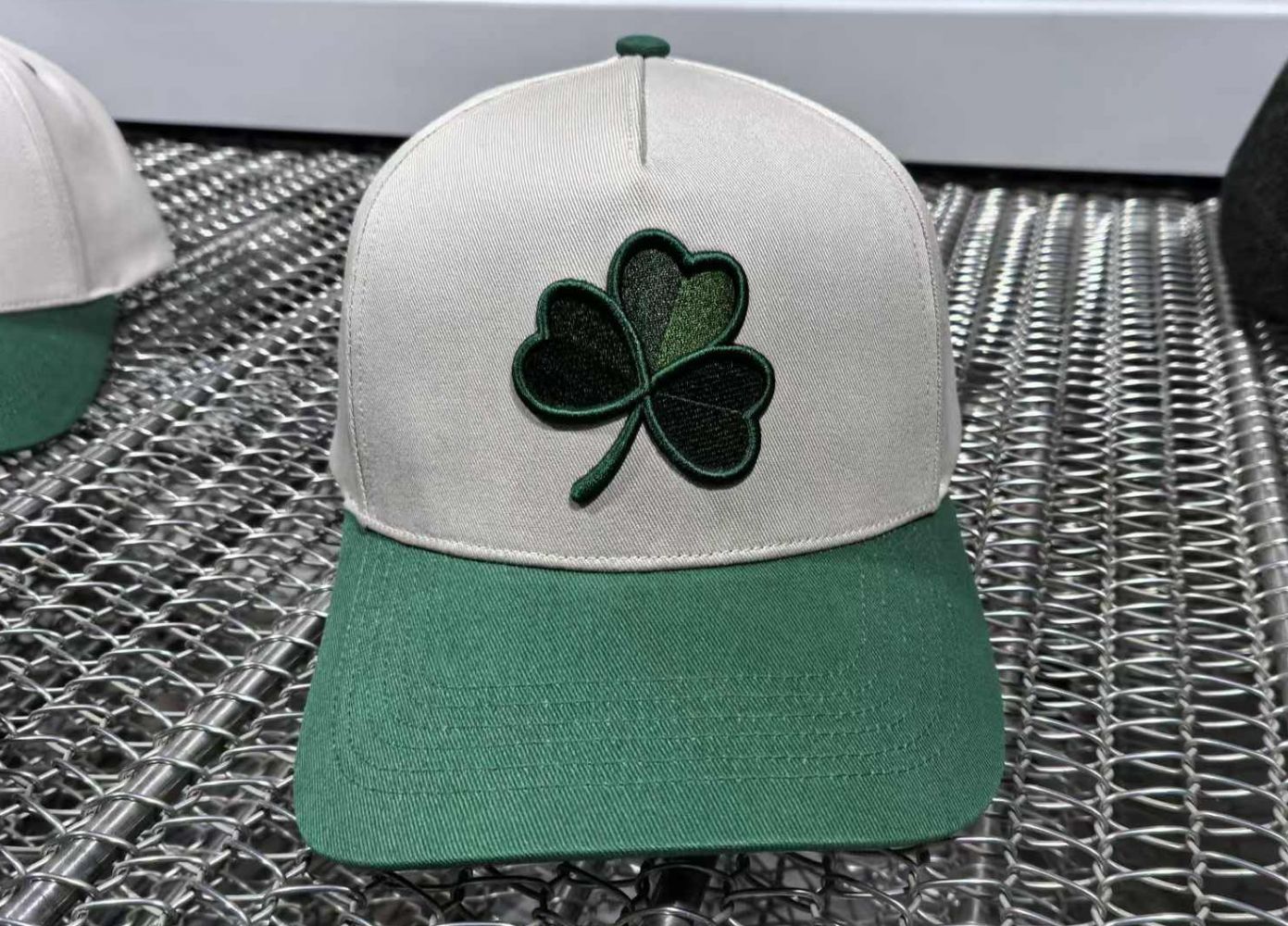 Creamwhite Base Cap with multicolor green embroidered SHAMROCK and backside logo .