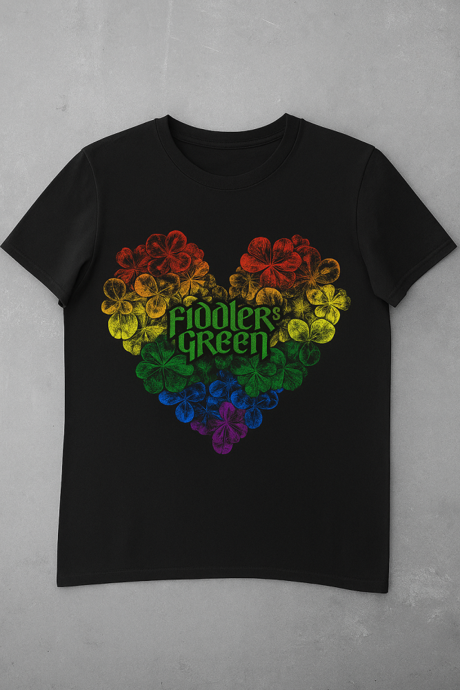 Rainbow colored "HEART" for One Love, black Shirt with multicolor front and backside label.